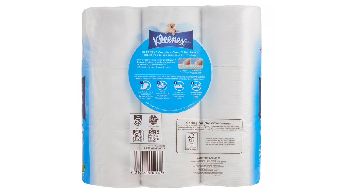 Kleenex Complete Clean Toilet Tissue with unique CleanRipple® texture has a 3-in-1 combination of softness, strength & absorbency for a comfortable and reliableKleenex Complete Clean Toilet Tissue with unique CleanRipple® texture has a 3-in-1 combination of softness, strength & absorbency for a comfortable and reliableKleenex Complete Clean Toilet Tissue with unique CleanRipple® texture has a 3-in-1 combination of softness, strength & absorbency for a comfortable and reliableKleenex Complete Clean Toilet Tissue with unique CleanRipple® texture has a 3-in-1 combination of softness, strength & absorbency for a comfortable and reliable clean.